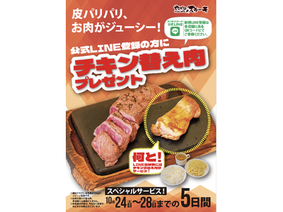 【やっぱりステーキ】公式LINE登録者限定!皮はパリパリ、お肉がジューシーな「チキン替え肉」のプレゼントキャンペーンを一部店舗で開催!