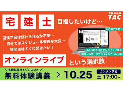 TAC株式会社(代表取締役:多田敏男)は、2026年(令和8年度)宅地建物取引士試験合格を目指す方へ、10/25(土)17:00より「宅建試験ガイダンスつき無料体験講義」をオンライン開催します...