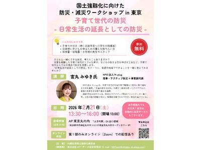 子育て世代の防災 日常生活の延長としての防災 2026年2月21日(土)AP東京丸の内 にて、内閣官房国土強靱化推進室主催「国土強靱化に向けた防災減災ワークショップ in 東京」を開催します。...