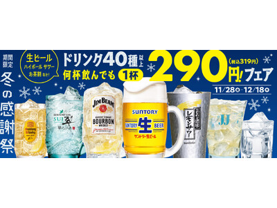 【焼肉の和民】冬の感謝祭!ドリンク40種類以上何杯飲んでも1杯290円フェア開催!冬の忘年会シーズンの乾杯をもっと楽しく!期間限定の特別価格でご提供します。