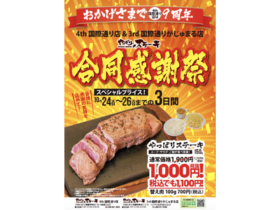 【やっぱりステーキ】4th 国際通り店がおかげさまで9周年3rd 国際通りがじゅまる店と合同で感謝祭を開催!やっぱりステーキ(ミスジ)を24日(金)から3日間限定で特別価格で販売!