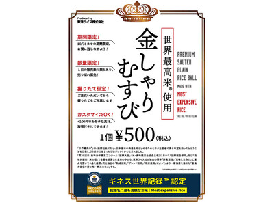 ~1kgあたり1万円超えのコメでつくる「おむすび」が登場~ ギネス世界記録(TM)認定「世界最高米」を使用した「金しゃりむすび」を期間限定発売!