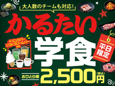 学園祭や体育祭の打ち上げに!学生専用食べ放題が2,500円で新登場!カルビ、ハラミ、タンなど全28品のラインアップ。ソフトドリンクバー付き
