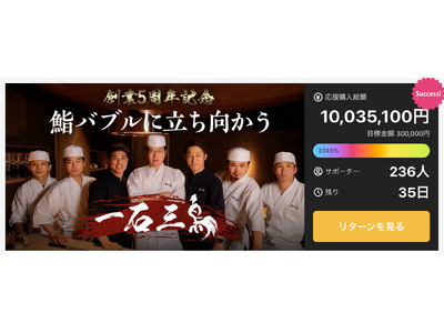 公開後5日で応援金額1000万円突破 一石三鳥グループ(代表:米田拓史)は、2026年春に渋谷へオープン予定の新店舗「鮨匠 一石三鳥」の開業に先立ち、応援購入サービス「Makuake」にて特別...