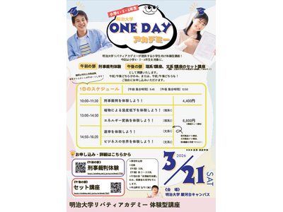 ~大学の文系理系両方の学問を1日で体験してみよう!~ 明治大学の生涯学習機関「明治大学リバティアカデミー」は、3月21日(土)に小学校456年生を対象とした体験型講座「明治大学ONE DAYア...