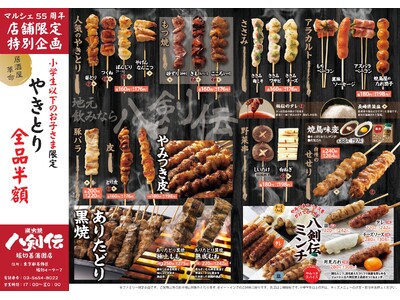【居酒屋革命!】人気の焼鳥が半額!?八剣伝 堀切菖蒲園店で小学生以下のお子様に向けお得なメニューを提供開始