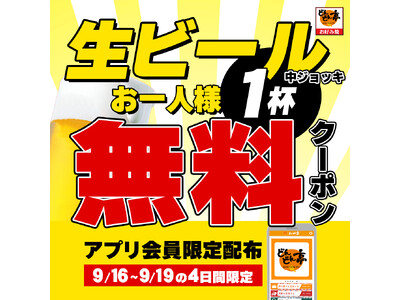 どんどん亭で2025年9月16日(火)より4日間限定開催!キンキンに冷えた生ビール×お好み焼の組み合わせをお得に楽しもう! アプリ会員限定の生ビール一杯無料クーポンを配信します 生ビールが無料...