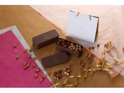 "明治記念館のパティシエが手仕込みで仕上げる、ローストした2種類のナッツの香ばしきショコラアンサンブル" 「アーモンド」と「ヘーゼルナッツ」のショコラ缶