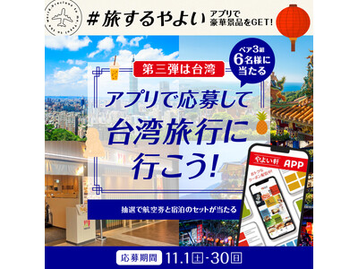 「やよい軒」公式アプリで開催豪華景品をGET!!「#旅するやよい」【第三弾】公式アプリで応募して台湾旅行に行こう!台湾旅行ペア3組6名様に当たる!