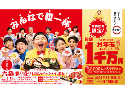 <1月9日(金)より全国のスシローにて販売開始> 株式会社あきんどスシロー(本社:大阪府吹田市、代表取締役社長:新居 耕平)は、1月9日(金)より"みんなで腹一杯。スシローからのお...