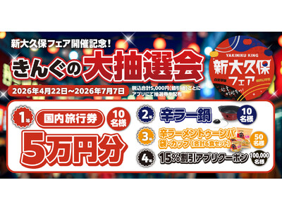 全国で365店舗を展開する『焼肉きんぐ』は、「新大久保フェア」の開催を記念して、2026年4月22日(水)より豪華賞品が当たる「きんぐの大抽選会」を実施いたします。 「きんぐの大抽選会」につい...