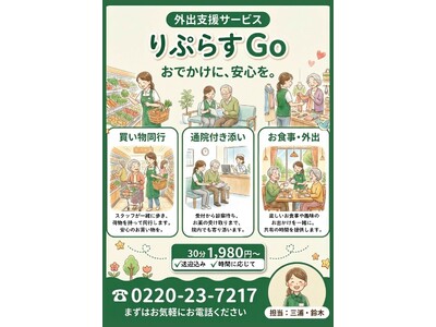 「自分らしい暮らし」を実現。介護保険でカバーできない社会参加をサポート 一般社団法人りぷらす(代表理事:橋本大吾、宮城県石巻市)は、2026年4月15日よりスタジオぷらす登米において「外出支援...