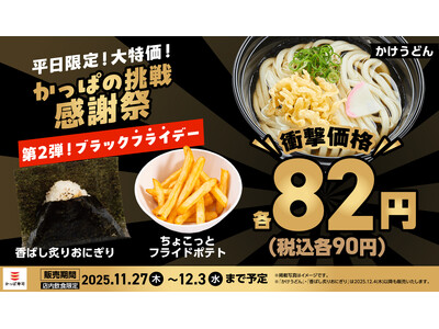 "ブラック"の海苔につつまれた「おにぎり」と"ブラック"の器の「うどん」も衝撃価格の各82円(税込各90円)で引き続きご提供 2025年11月27日(木)~12月3日(水)まで予定、かっぱ寿司...