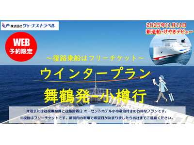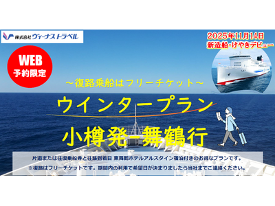 旅行企画実施 株式会社ヴィーナストラベル 2025年11月14日にデビューした「新造船けやき」もご利用いただける 冬限定のお得な船旅「ウインタープラン」を発売いたしました。 おひとり様から乗用...