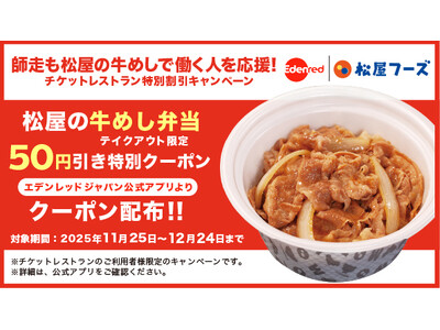 ~テイクアウト限定「牛めし弁当」50円引きクーポンを配布~ 株式会社エデンレッドジャパン(所在地:東京都港区、代表取締役:天野総太郎)と株式会社松屋フーズ(本社:東京都武蔵野市、代表取締役社長...