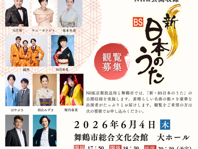 坂本冬美、山内惠介、純烈らが出演。舞鶴市総合文化会館にて全国公開収録を実施 舞鶴市は、NHK京都放送局との共催により、令和8年6月4日(木)に舞鶴市総合文化会館にて「新BS日本のうた」の公開収...