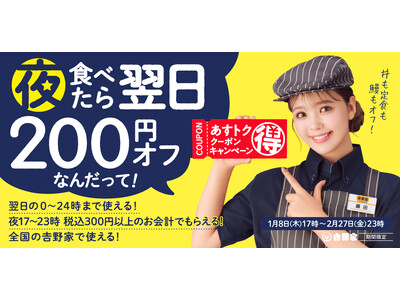 株式会社吉野家(本社:東京都中央区、代表取締役社長:成瀬哲也、以下吉野家)は、1月8日(木)17時から2月27日(金)23時までの期間、全国の吉野家店舗で【夜食べたら翌日が200円オフ】となる...