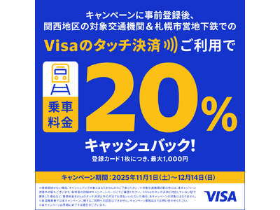 「Visaのタッチ決済で鉄道がお得!20%キャッシュバックキャンペーン」を関西エリアと札幌市内の鉄道事業者で11月1日より開始