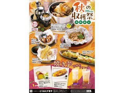~ 旬な秋の味覚9種類を期間限定でお楽しみください ~ 「くつろぎ」の空間を提供し、お食事を楽しんでいただく居酒屋「とりあえず吾平」では「秋の収穫祭」を9月17日(水)より期間限定で開催いたし...