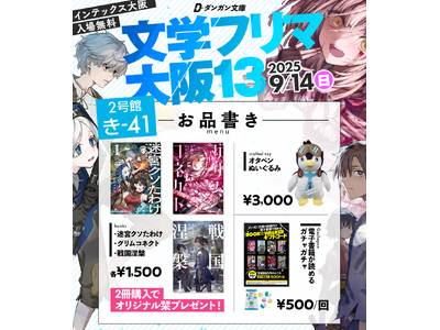 株式会社BookBase(本社:大阪市)が運営する『ダンガン文庫』は2025年9月14日(日)に開催される文学フリマ大阪13に初出展します!人気タイトルの紙書籍を会場で先行販売! 株式会社Bo...