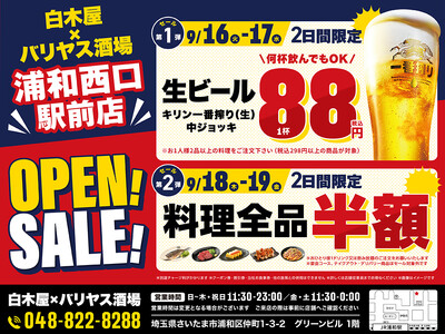 2025年9月16日(火)埼玉県さいたま市の浦和西口駅前に、コスパ抜群の「白木屋×バリヤス酒場」をオープン!