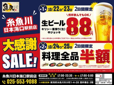 【大感謝セール】新潟県糸魚川市の「魚民 糸魚川日本海口駅前店」で、日ごろのご愛顧に感謝し、2025年10月22日(水)から4日間限定の「大感謝セール」を開催します!