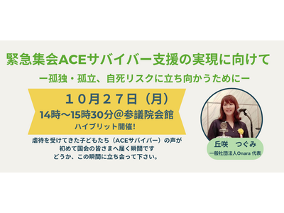 子供時代の虐待が、大人になってトラウマに。ACE(逆境的小児期体験)を抱え生きる人の現実を伝えるため参議院会館で院内集会を10月27日に開催。虐待サバイバー:丘咲つぐみ 代表(一社)Onara主催