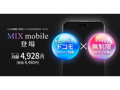 安定の通信と安心のデータ容量 2つの回線で安定してつながるSIMサービス! 新ブランド「MIX mobile」公開!特典付き先行予約を開始
