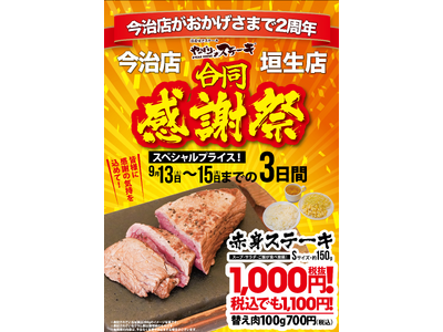 【やっぱりステーキ】今治店がオープンから2周年!日頃のご愛顧に感謝の気持ちをこめて垣生店と合同でお得な感謝祭を開催!
