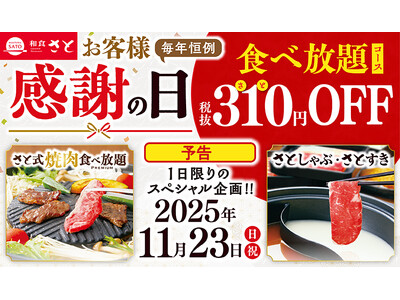 お客様感謝の日『11月23日(日祝)』が今年もやってきました!! さと式焼肉/さとしゃぶorさとすき黒毛和牛牛&豚プレミアムコース対象!! 和食さと 年に一度のプレミアムデー!!今年の...