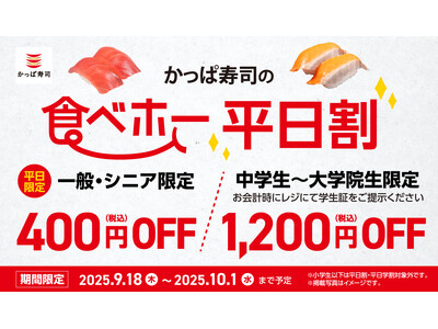 "秋の大盤振る舞い"!かっぱ寿司の食べ放題「かっぱの食べホー」に9月18日(木)から期間限定400円OFF※の「平日割」が新登場!さらに、学生証を見せると「平日学割」も適用で、最大1,200円OFF!