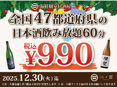 【全国の日本酒勢ぞろい】60分¥990-で全国47都道府県の日本酒飲み放題!|「海鮮個室居酒屋 二ノ宮」にて開催