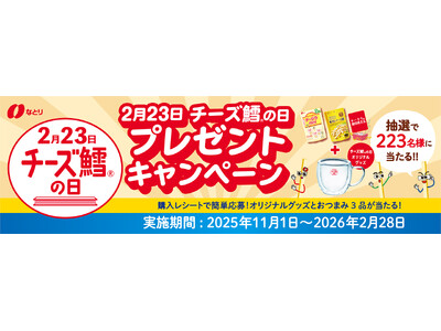 2025年11月1日(土)~2026年2月28日(土) 株式会社なとり(本社:東京都北区 会長兼社長:名取三郎)は、「チーズ鱈の日プレゼントキャンペーン」を2025年11月1日(土)~実施いた...
