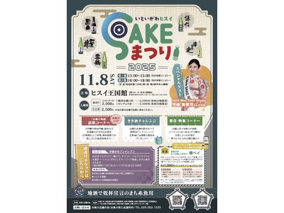 開催日:令和7年11月8日(土)※2部制完全入替制定員あり 「地酒王国」新潟県。新潟県の西端にある糸魚川市の全5酒蔵が集合する日本酒試飲イベント「いといがわヒスイSAKEまつり」を開催します。...