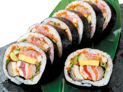【販売実績100万本】多彩な海鮮と、旨みの食材を絶妙なバランスで重ね、職人が一本一本丁寧に巻き上げた「がってん寿司」史上最大の特大太巻き。18種の豪華具材が織り成す"極"の味わいを届けます。