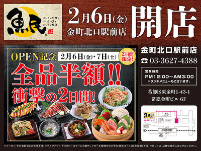 2026年2月6日(金)東京都葛飾区の金町駅前に「魚民 金町北口駅前店」をリニューアルオープン!2日間限定で"全品半額の新店オープン記念セール"を実施!