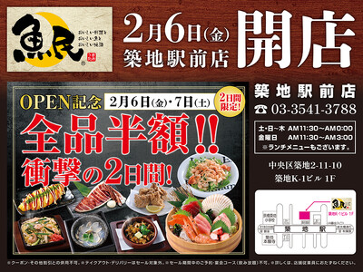 2026年2月6日(金)東京都中央区の築地駅前に「魚民 築地駅前店」をリニューアルオープン!2日間限定で"全品半額の新店オープン記念セール"を実施!