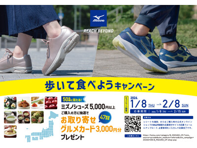 チヨダの店舗でMIZUNOシューズを購入すると、お取り寄せグルメカードが50名様に当たる!「MIZUNO 歩いて食べようキャンペーン」を1月8日より開催!
