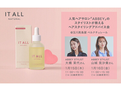 【1月15,16日】人気ヘアサロンABBEYスタイリストのヘアスタイリングアドバイス会。天然由来99.99%マルチユースな『IT ALL NATURAL Charm Oil』で‟こなれヘア"を実現!