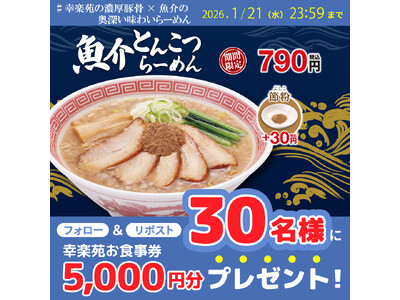 株式会社幸楽苑(本社:福島県郡山市)が運営する「幸楽苑」は、2026年1月8日(木)10:00~、新商品「魚介とんこつらーめん」790円(税込)の発売を記念し、対象ポストからご応募いただきます...
