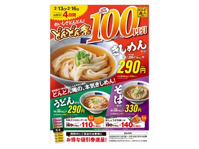 【どんどん庵】全店開催!自慢の「きしめん」含む麺3品が100円引2月13日(金)より、4日間限定の『どんどん祭』がスタート!