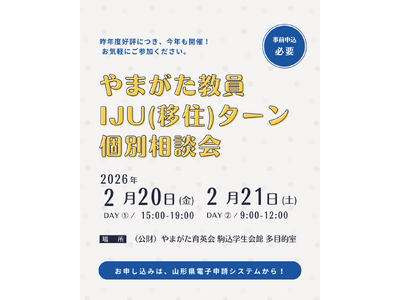 IJUターンを検討している皆さん! 山形で新たな生活をスタートしませんか? 山形県教育委員会では、山形県での教育や暮らしに関心を持つ方を対象に、「山形県 教員IJUターン個別相談会」を、東京(...