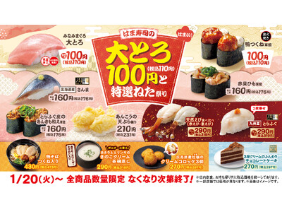 株式会社はま寿司(代表取締役社長:南 哲史 本社:東京都港区)が展開する100円寿司チェーン「はま寿司」は、1月20日(火)より、「はま寿司の大とろ100円と特選ねた祭り」を全国の店舗で開催し...