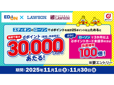 株式会社NTTドコモ(以下、ドコモ)は、エディオンローソンにおいて「抽選でdポイント最大3万ポイント当たるキャンペーン(以下、本キャンペーン)」を、2025年11月1日(土)から2025年11...