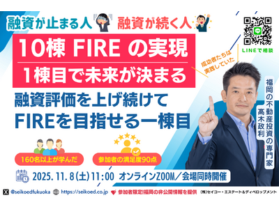 11/8開催!福岡の不動産投資でFIREを目指す。融資が続く人・止まる人の物件選びの違いとは?会社員でも5年で10棟FIREした現役投資家から学ぶ。160名以上が学んだGOALから逆算する不動産投資