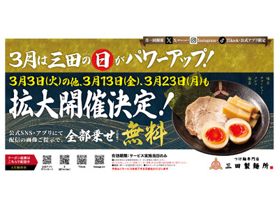 毎月恒例の"3日"に加え、3月13日(金)3月23日(月)も特別開催いたします。 株式会社エムピーキッチンホールディングス(本社:東京都渋谷区、代表取締役CEO:鹿中 一志)が運営する『つけ麺...