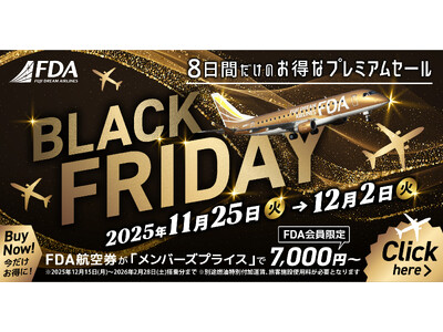 株式会社フジドリームエアラインズ(略称:FDA、本社:静岡県静岡市、代表取締役社長:本田 俊介)は2025年11月25日(火)~12月2日(火)の期間で『ブラックフライデーセール』を実施します...