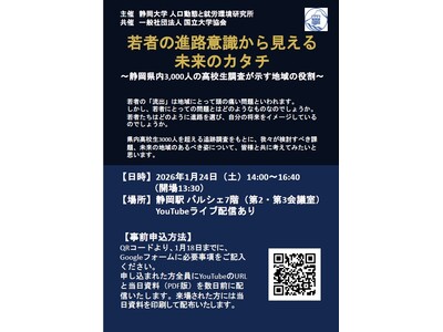 2026年1月24日開催!静岡県内3,000人の高校生調査が示す地域の役割について考えます 静岡大学のプロジェクト研究所「人口動態と就労環境研究所」では、今後の地域形成のあり方を考えるシンポジ...