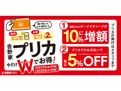 お得な「吉野家プリカ」キャンペーンを本日から開始チャージをすると10%のボーナスチャージを付与会計時は会計金額(税込)より5%オフ
