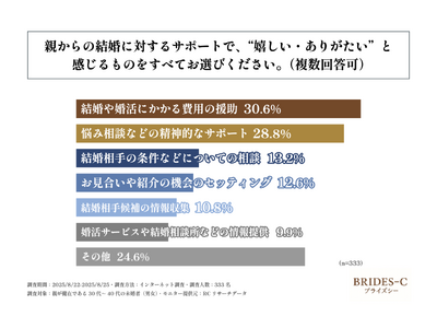 30代~40代の未婚者が、親からの結婚サポートで嬉しいと感じるもの第1位は「結婚や婚活にかかる費用の援助」!株式会社ブライズシーが「結婚と親子関係」に関する調査を実施!